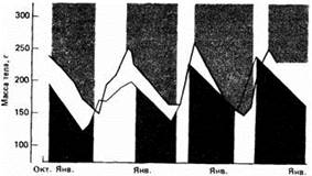 Рис.9. Цирканнуальные ритмы изменения массы тела и периоды зимней спячки двух особей Citellus lateralis, содержавшихся в неизменных лабораторных условиях. |