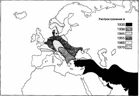 Рис.10. Карта расширения ареала кольчатой горлицы в XX столетии. |