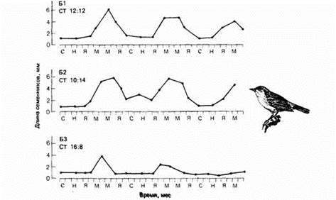 Рис.11. Цирканнуальные ритмы изменения длины семенников у садовых славок, содержавшихся в течение трех лет в неизменных фотопериодических условиях. СТ соотношение света и темноты. |