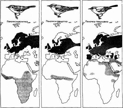 Рис.12. Места гнездовий, зимовок и их перекрывания у некоторых мигрирующих пеночек.