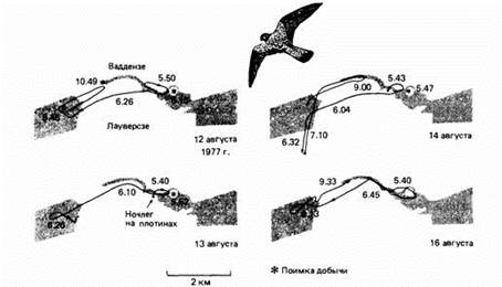 Рис. 19. Передвижения пустельги, наблюдавшееся в Нидерландах 12, 13, 14 и 16 августа 1977 г. Цифры на маршрутах полета - время суток. Суша обозначена темным, море - светлым. |