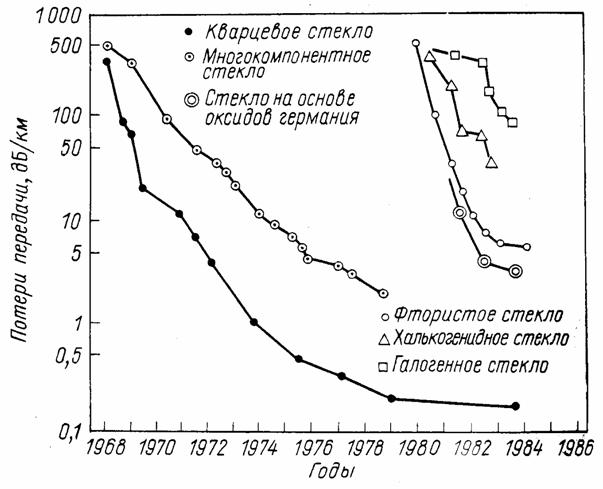 Рис. 2. Снижение минимальных потерь передачи для различных типов оптических волокон |