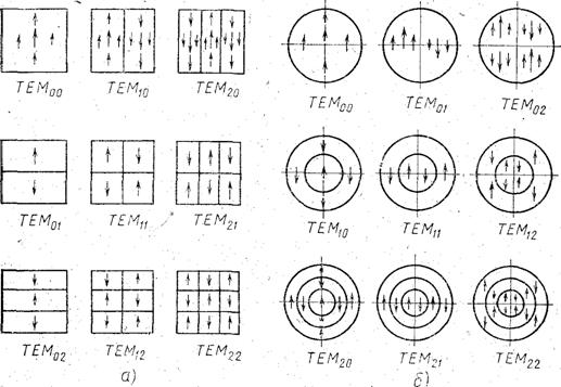 Каждый поперечный тип колебаний характеризуется определённой структурой поля в поперечном сечении резонатора и характеризуется заданием чисел m и n Для резонатора с прямоугольными зеркалами m и n показывают число изменений направления поля вдоль осей x и y , соответственно. Для круглых зеркал m характеризует число изменений поля по радиусу, а n - по азимуту.