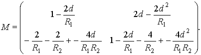 свободное пространство (d), линза (f1), свободное пространство (d), линза (f2). Матрица передачи такого элемента имеет вид: