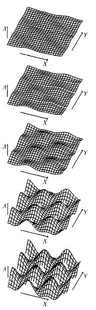 Поведение параметра порядка в этом примере можно проиллюстрировать двумя способами, как и во всех предыдущих случаях. Во-первых, соответствующей пространственной или временной моделью; во-вторых, используя точные расчеты. Как только мы опишем фундаментальные процессы в форме уже упоминавшихся ранее уравнений диффузии, синергетические методы позволят нам получить результирующее распределение концентраций. Как мы вскоре увидим, одинаковые пространственные структуры могут возникать даже в результате совершенно различных процессов (Рис. 12).