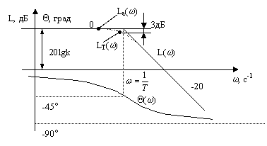 Обычно строят асимптотические ЛАЧХ: на стандартной сетке ( с масштабом 1 декада – увеличение частоты в 10 раз – 100 мм, 20 дБ – 40 мм) проводят вертикальную штриховую линию через точку с частотой, называемой сопрягающей, w=1/Т. Левее сопрягающей частоты проводят прямую с уровнем 20lgk, а правее с наклоном – 20дБ/дек, соответствующую выражению 20lgk/wT. Точная ЛАЧХ будет несколько отличаться от асимптотической, причём наибольшее отклонение будет » 3 дБ.