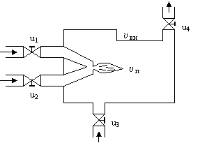 Управляющие воздействия - положения вентилей и шиберов u1¸u4, регулирующих подачу горючего, приток воздуха и вытяжку газов.