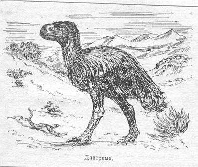 В эоцене ( среднетретичный период, 54-38 млн. лет назад ) существовала птица Диатрима. С виду она напоминала страуса. Рост ее составлял около 2-3 метров, длина клюва- до 50 сантиметров. На сильных лапах у нее имелось по четыре пальца с длинными когтями. Летать диатримы не умели, зато отлично бегали.