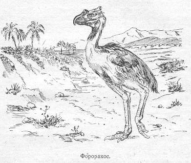 Фороракос достигал 1,5 м в высоту. Его острый крючковатый полуметровый клюв был весьма грозным оружием. Поскольку у него были маленькие, неразвитые крылья, он не мог летать. Длинные, сильные ноги фороракосов свидетельствуют о том, что они были прекрасными бегунами. По мнению некоторых исследователей, роди ной этих огромных птиц была Антарктида, покрытая в то время лесами и степями. Большинство же ученых склоняется к выводу, что фороракос обитал па территории тогдашней Южной Америке.