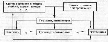 Во всех этих процессах важнейшую роль играют фитогормоны и эндогенные ингибиторы роста и метаболизма (некоторые полифенолы). Участие фитогормонов в процессах фотосинтеза можно представить в виде следующей схемы, предложенной А. Т. Мокроносовым (1983):