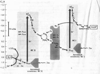 Исходя из данных о квантовом выходе фотосинтеза (необходимы 8 квантов света для выделения одной молекулы 02) из состава компонентов, входящих в ФС I и ФС II, и величин их окислительно-восстановительного потенциала была разработана схема последовательности реакций в световой фазе фотосинтеза.