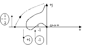 Для анализа устойчивости системы АФХ дополняют окружностью бесконечно большого радиуса при w®0 против часовой стрелки до положительной вещественной полуоси, а в случае чисто мнимых корней - полуокружностью по часовой стрелке в точке разрыва непрерывности АФХ.