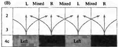 (А) Глазные предпочтения е 1116 клетках в зоне V1 у 28 макак резус. Большинство клеток (группы со второй по шестую) получают информацию от обоих глаз. (В) Диаграмма, показывающая каким образом информация от двух глаз, направляющаяся в слой 4 коры, комбинируется в более поверхностных слоях при помощи горизонтальных и косых соединений, дающих клетки с бинокулярными полями.