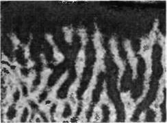 Рис. 2. Выявление глазодоминантных колонок с помощью оптической регистрации. Чувствительная камера обнаруживает оптический сигнал в коре обезьяны во время стимуляции только одного глаза. Изменения в интенсивности сигнала кодируются при помощи цвета, поэтому активные зоны выглядят в виде светлых полос. Паттерн светлых полос соответствует колонкам глазного доминирования, выявляемым при маркировании анатомическими методами.