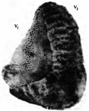 Рис. 4. «Пятна» в зоне V1 и «полоски» в зоне V2 зрительной коры обезьян, окрашенной на цитохромоксидазу. Пятна организованы в виде узора «в горошек». Можно различить четкую границу между зонами V1 и V2 . По этой линии «пятна» переходят в «полоски», толстые и тонкие, идущие под определенным углом к границе.