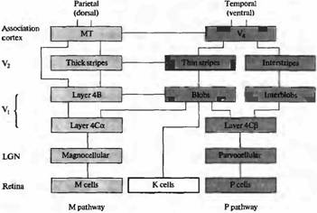 Значительные усилия были потрачены для понимания процесса переработки информации в М- и Р-каналах зрительной коры. Подобные исследования были вызваны функциональными и анатомическими различиями ганглиозных клеток сетчатки и нейронов коленчатого тела (рис. 4). Дополнительная информация обеспечивалась психофизическими экспериментами, исследованием строения головного мозга, изучением пациентов с различными мозговыми повреждениями. Все это привело к предположению, что различные типы анализа зрительной информации производятся в физически изолированных регионах мозга, в так называемых ассоциативных зонах коры. Дорзальный или париетальный тракт (называемый так потому, что соответствующие зоны коры находятся в теменной доле, расположенной более дорзально по отношению к первичной зрительной коре), как считают, является важным звеном в оценке движения и пространственного взаиморасположения форм — свойств, сходных со свойствами М-каналов, которые мы уже описали. Повреждения дорзального, париетального тракта выражаются в игнорировании участка зрительного поля и нарушении видеомоторной ориентации. Повреждения в области височной коры (вентральнее V1) уменьшают способность к зрительной идентификации объектов, их цветов и тонких деталей — отражая свойства Р-каналов.