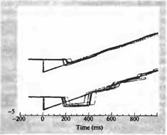 Зона МТ играет важную роль в процессе зрительного слежения. Это было показано рядом экспериментов, в которых обезьяну обучали следить глазами за движущимся предметом (рис. 5). Нормальный паттерн движения глаз показан на верхней записи на рис. 5. При этом при движении объекта (траектория начинается от точки 0) глаза фокусировались на нем при помощи быстрого, отрывистого движения (с отклонением вниз через 200 миллисекунд), а затем при помощи аккуратного слежения предмет удерживался в области зрительной ямки. После введения небольшого количества нейротоксина (иботеновой кислоты) в зону МТ, в область представительства центральной ямки, способность обезьяны следить за движущимся объектом значительно нарушалась. В частности, после первого быстрого движения дальнейшая скорость слежения была значительно ниже скорости перемещения объекта. Нарушено было также и само начальное установочное движение глаз (рис.5, нижний пробег). Таким образом, повреждение зоны МТ приводило к тому, что животное теряло способность адекватно отслеживать движение объекта.