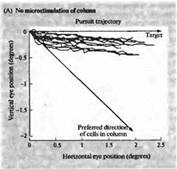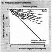 Рис. 6. Изменение направления движения глаза при электрической стимуляции в области МТ (А) Запись движения глаза в ответ на движущийся зрительный стимул. До этого микроэлектрод был введен в область зоны МТ, и было определено предпочтительное направление движения для клеток этой области, которое отличается от направления движения данного стимула (В). При электрической стимуляции зоны МТ результирующий вектор движения отклоняется в сторону. Эти данные дают основания предполагать, что зрительные движения вычисляются как суммарный вектор нескольких предпочтительных направлений в зоне МТ.