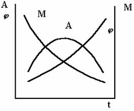 В полярных диэлектриках, помимо потерь на сквозную электропроводность, появляются потери на поляризацию, то есть внешнее электрическое поле совершает работу по повороту диполей. Эту работу можно оценить как произведение момента сил (М) на угол поворота (f). При увеличении температуры подвижность диполей растет, и момент сил, необходимый для поворота на один и тот же угол, снижается. В то же время, рост подвижности диполей при повышении температуры ведет к увеличению угла поворота под действием постоянного момента сил (рис. 37). Таким образом, работа, совершаемая электрическим полем на поворот диполей, при росте температуры вначале увеличивается, а затем уменьшается.