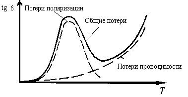 Помимо потерь энергии поля на поляризацию, в полярных диэлектриках существуют потери на сквозную электропроводность. Важно отметить, что хотя качественно процесс электропроводности в полярных диэлектриках не отличается от процесса электропроводности в неполярных диэлектриках, количественные различия имеются. Так, в полярных диэлектриках концентрация носителей заряда, как правило, повышена, поскольку из-за полярности молекул основного материала очистка его от примесей затруднена. Суммируя потери на сквозную проводимость и поляризацию, получаем зависимость tgd от температуры показанную на рис. 38.