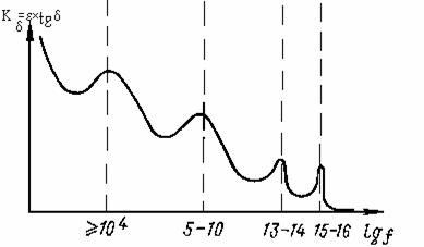 Как отмечалось выше, при нахождении диэлектрика в электрическом поле в нем развиваются два процесса: электропроводность и поляризация. Оба процесса сопровождаются потерями энергии электрического поля. Потери на электропроводность при росте частоты снижаются. Однако на определенных частотах резко возрастает резонансная поляризация, поэтому коэффициент диэлектрических потерь Кd на этих частотах резко возрастает. На рис.39 показана зависимость коэффициента диэлектрических потерь от частоты электрического поля для диэлектрика сложного состава. Как видно из приведенного рисунка, на определенных частотах начинается резонансная поляризация полярных молекул различных компонентов диэлектрика, а следовательно, возрастают потери.