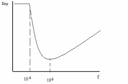 Процессы изменения концентрации ионов, происходящие в низкочастотных полях, аналогичны процессам в постоянном поле. Однако в высокочастотных полях концентрация заряженных частиц меняется. При достаточно высоких частотах подвижные электроны успевают сместиться на большие расстояния и достигают электродов. Малоподвижные положительные ионы с большой массой за время полу периода колебаний не успевают сместиться на сколь либо значительные расстояния и концентрация положительных ионов в межэлектродном пространстве растет. Появляется так называемый «объемный заряд». Поэтому, начиная с частот, превышающих десятки килогерц вероятность столкновения ионов с молекулами возрастает и электропрочность газов снижается (рис. 42). Дальнейший рост частоты электрического поля (или уменьшение его полу периода) приводит к тому, что за время полу периода не только положительные ионы не успевают сместиться на сколь либо значительные расстояния, но и электроны не успевают вылететь из межэлектродного пространства. Вероятность рекомбинации заряженных частиц растет и их концентрация падает. Кроме того, снижение времени полу периода требует увеличения силы, действующей на ионы, чтобы кинетической энергии хватило для ионизации молекул. Поэтому при частотах, превышающих мегагерц, электропрочность газов возрастает.