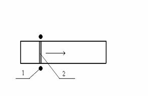 Рис. 53. Схема зонной плавки. 1 – нагреватели; 2 – зона расплавления. Стрелкой показано направление движения зоны распавления. |