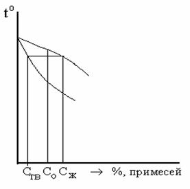 Рис. 54. Участок диаграммы состояния материала содержащего примеси. Со – исходный состав материала, Ств – состав твердой фазы, Сж – состав жидкой фазы. |