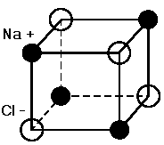 При образовании ионной связи кристаллические решетки получаются более компактными, координационное число достигает 6. Это связано с тем, что ионная связь не насыщена, хотя и направленна. Типичным представителем веществ с таким видом связи является соединение NaCl; кристаллическую решетку такого соединения можно представить в виде примитивного куба, в вершинах которого расположены ионы хлора и натрия. Элементарная ячейка кристаллической решетки такого соединения показана на рис. 8.