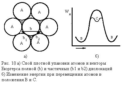 Данная ситуация иллюстрируется рисунком 18. Как видно из рисунка, при движении полной решеточной дислокации с вектором Бюргерса b атомы перемещаются из одних равновесных положений в другие (например, из положения В в положение В). При этом кристаллическая решетка вдали от дислокации остается правильной. При расщеплении полной дислокации на две частичные движение частичных дислокаций приводит к образованию дефекта упаковки. При этом энергия атомов, смещенных в положение С, повышается.