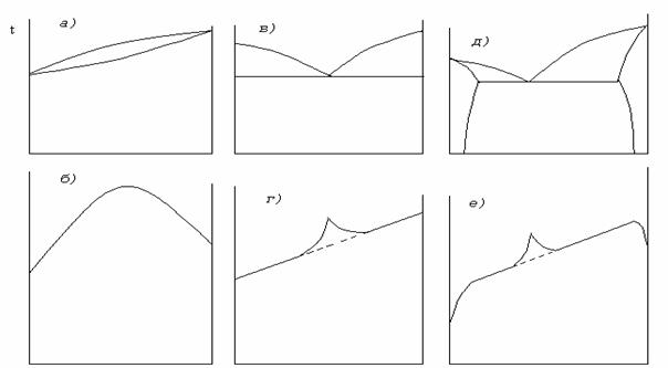 Рис.22. Диаграммы состояния и зависимость свойств от состава для случаев: а), б) неограниченной растворимости компонентов в твердом состоянии; в), г) отсутствия растворимости компонентов в твердом состоянии; д), е) ограниченной растворимости компонентов в твердом состоянии. |