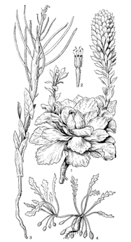 Рис. 30. Крестоцветные. Кергеленская капуста (Pringlea antiscorbutica): 1 - общий вид растения с плодами; 2 - цветок. Каулантус вздутый (Caulanthus inflatus): 3 - общий вид растения с плодами. Геококкус крошечный (Geococcus pusillus): 4 - общий вид растения с подземными плодами.