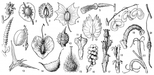 Рис. 31. Различные формы плодов у крестоцветных: 1 - мурикария простертая (Muricaria prostrata); 2 - тизанокарпус кривоногий (Thysanocarpus curvipes); 3 - крылотычинник красивенький (Acthionema pulchellum); 4 - крылотычинник арабский (A. arabicum); 5 - вайда птицеклювая (Isatis ornithorhynchus); 6 - крупноплодник гигантский (Megacarpaea gigantea); 7 - энартрокарпус изогнутый (Enarthrocarpus arcuatus); 8 - пузыреплодник пузырчатый (Coluteocarpus vesicaria); 9 - вайда Бессера (Isatis besseri); 10 - крепкоплодник сирийский (Euclidium syriacum); 11 - полевка пронзеннолистная (Myagrum perfiliatum); 12 - крылотычинник складчатый (Acthionima diastrophis); 13 - пугиониум рогатый (Pugionium cornatum); 14 - таушерия волосистоплодная (Tauscheria lasiocarpa); 15 - шерстоплодник Лемана (Lachnoloma lehmannii); 16 - двойчатка Федченко (Didymophysa fedtschenkoana); 17 - тетракмидион бухарский (Tetracmidion bucharicum); 18 - тетракмидион якорный (T. glochidiatum); 19 - тетракме памирский (Tetracme pamirica); 20 - тетракме загнутый (T. recurvata).