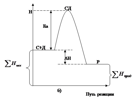 На рисунке а) видно, что продукты реакции обладают большим запасом энергии, чем исходные вещества, то есть реакция А + В ® S эндотермическая. Разность между энергией продуктов реакции и исходных веществ является тепловым эффектом реакции