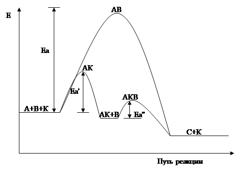 Гомогенный катализ осуществляется чаще всего через образование неустойчивых промежуточных продуктов. Например, реакция А + В → С требует большой энергии активации Еа. В присутствии катализатора протекают реакции А + К → АК и АК + В → С + К, где К – катализатор.