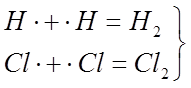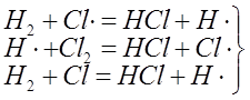 За счет внешнего источника энергии (свет, электрический разряд, нагревание, воздействие ά-, β- или γ- излучения) образуются свободные радикалы или атомы, обладающие свободными валентностями. Они взаимодействуют с молекулами. В каждом звене цепи вновь образуется новая активная частица. Путем повторения одних и тех же элементарных процессов происходит протекание цепной реакции. Ее продолжительность может быть очень большой. В приведенной выше реакции на каждый поглощенный квант образуется до 100 тыс. молекул НСl. Столкновение двух одинаковых радикалов при условии, что выделяющаяся при этом энергия может быть отдана третьему телу, приводит к обрыву цепи. Причиной обрыва может служить не только рекомбинация свободных радикалов, но и их захват стенкой реакционного сосуда, взаимодействие радикала с примесями, а также образование малоактивного радикала (обрыв в объеме). Поэтому скорость цепной реакции очень чувствительна к наличию посторонних частиц и форме сосуда.