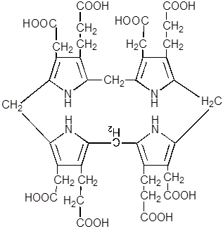 8. В результате декарбоксилирования всех четырёх остатков ацетата из уропорфириногена III образуется копропорфириноген III, фермент – уропорфириногендекарбоксилаза.