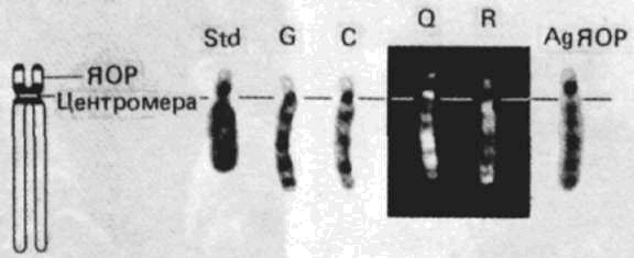 Фотография метафазной хромосомы человека N 13. Видны общее строение хромосомы (Std), характер полос в эухроматиновых плечах, выявляемый после специального окрашивания (три разных метода окрашивания G, Q и R), гетерохроматиновая область в центромере, наблюдаемая благодаря применению особой техники окрашивания (С-окрашивание) и район ядрышкового организатора (ЯОР), также выявляемый с помощью специального окрашивания (АдЯОР). Положение центромеры на этой акроцентрической хромосоме отмечено горизонтальной линией.