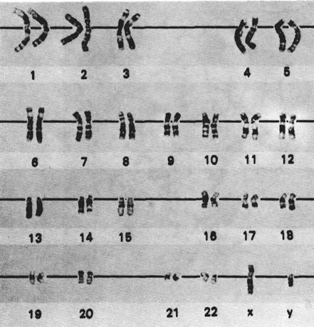 Четко различимые морфологические признаки индивидуальных прометафазных и политенных хромосом стабильно воспроизводятся из поколения в поколение у данного вида. Необычная форма хромосом или характер полос наряду с атипичным числом хромосом сигнализируют о повреждении хромосомного материала. Наличие таких измененных хромосом часто связано с наследственными заболеваниями. Например, сегмент одной хромосомы иногда перемещается на совершенно неродственную хромосому, и такие перестройки сразу выявляются по необычному размеру или характеру полос. Подобные транслокации иногда бывают реципрокными, т.е. две неродственные хромосомы могут обменяться фрагментами. Другим примером изменений, или аберраций, хромосом служат делеции части нормальной хромосомы, дупликации некоторых областей и даже инверсии сегментов. Иногда наблюдаются потери хромосом или, напротив, появление лишних. Например, заболевание человека, известное как синдром Дауна, обусловлено присутствием трех копий 21-й хромосомы вместо обычных двух (это состояние называют также трисомией 21-й хромосомы).