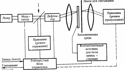 Структурная схема оптической памяти с побитовой записью информации показана на рис. 6. Основными компонентами системы являются лазерный источник излучения, модулятор, дефлектор для адресации луча, формирующая и фокусирующая оптика и запоминающая среда.