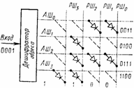 Типичная схема диодного ПЗУ показана на рис. 4. Структура - матричная: строки образуются адресными шинами, а столбцы - разрядными. Каждая шина хранит определенный код: 0011, 0100 и т. д. Запись осуществляется с помощью диодов, которые присоединены между адресными шинами и теми разрядными шинами, на которых (при считывании) должна быть логическая 1; подобные соединения отсутствуют там, где должны появиться нули. Схема работает следующим образом. В любой момент времени только на одной выходной линии дешифратора может быть высокий уровень напряжения. Ток с этой линии течет лишь на те выходные линии, с которыми эта линия соединена диодом.