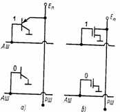 Рис. 4. Схема диодного постоянного ЗУ Рис. 5. Ячейки ПЗУ на биполярных (а) и МДП-транзисторах (б)