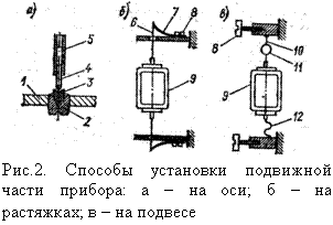 Подвижная часть прибора снабжается осью или полуосями, которые оканчиваются запресованными в них стальными кернами. Последние опираются на корундовые или рубиновые подпятники (Рис.2,а). Трение керна о подпятник снижает чувствительность и точность прибора, поэтому подвижную часть устанавливают на растяжках или подвесах (Рис.2,б,в).