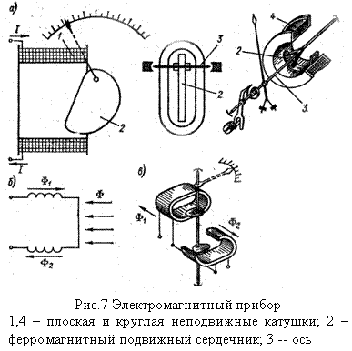 Узел для создания вращающего момента (рис.7,а) состоит из плоской или круглой катушки, по которой протекает измеряемый ток, и сердечника, закрепленного на оси указателя.