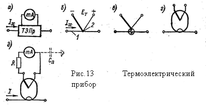 Термоэлектрические преобразователи разделяются на контактные (рис.13,б) и (рис.13, в) и вакуумные (рис.13, г). В контактном преобразователе имеется гальваническая связь между нагревателем и термопарой, т.е. между входной и выходной цепями, что не всегда допустимо. В бесконтактном преобразователе нагреватель отделен от термопары стеклянной или керамической бусинкой, так что между ними существует только незначительная емкостная связь. Чувствительность и бесконтактного преобразователя ниже чем у контактного. В вакуумного термопреобразователя ниже, чем у контактного. В вакуумном термопреобразователе нагреватель и термопара помещены в стеклянный баллончик.