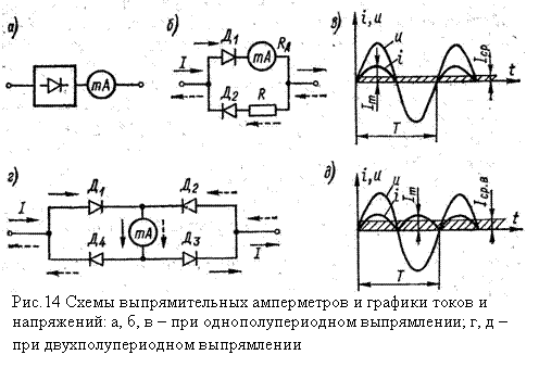 В схеме с двухполупериодного выпрямления (рис.14, г) измеряемый ток в течении положительного полупериода проходит по цепи Д1 – миллиамперметр – Д3 , а в течении отрицательного – Д2 – миллиамперметр – Д4. Показания миллиамперметра пропорционально средневыпрямленному значению переменного тока. Для синусоидального тока (рис.14, д)