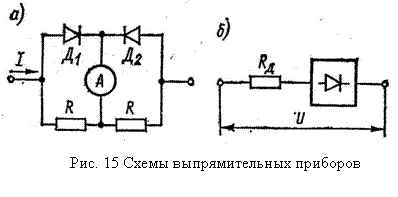 Для измерения тока и в цепях повышенной частоты широко применяют выпрямительные приборы, состоящие из выпрямительного преобразователя и магнитоэлектрического микро- или миллиамперметра (рис.14, а). В качестве выпрямительных элементов используются полупроводниковые (германиевые или кремниевые) диоды, выпрямляющее действие которых определяется коэффициентом выпрямления