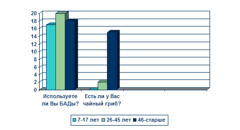 Опрос показал, что гриб есть в основном у людей преклонного возраста и частично у людей среднего возраста, а у подростков его и вовсе нет. Пробовали его в основном люди среднего возраста, а среди школьников пробовало меньшее количество, т.к. некоторые даже не знают о существовании целебного напитка или их поили их бабушки и дедушки.