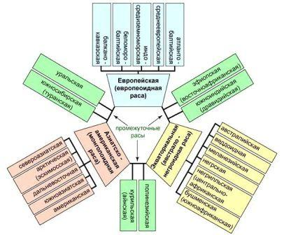 Рис. 4. Схема антропологического состава народов мира (малые расы, выделяемые внутри больших, отличаются друг от друга не столь существенными признаками).