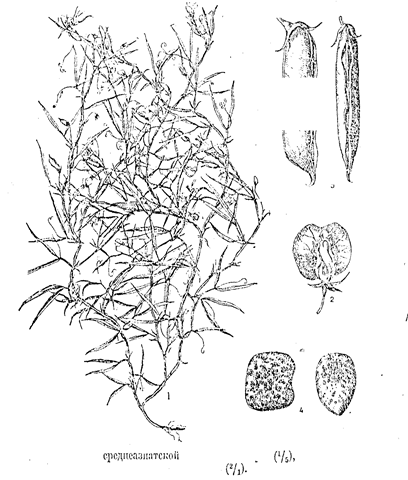 Среднеазиатская группа – распространена в узбекистане, таджикистане, туркменистане. Высота растений 35-65 см, растения слабоветвистые, стебель нежный, сильно полегающий. (рис ) Цветки одиночные, синие, наружняя сторона паруса пурпурного цвета. Семена мелкие, клиновидные, гладкие, различных оттенков серого или коричневого цвета с разнообразным рисунком. Вес 1000 семян 70-150 грамм. Вегетационный период 70-90 дней. Устойчива к воздушной засухе. Содержание белка 30-32%. Восприимчива к грибным болезням, требовательна к теплу, особенно в период